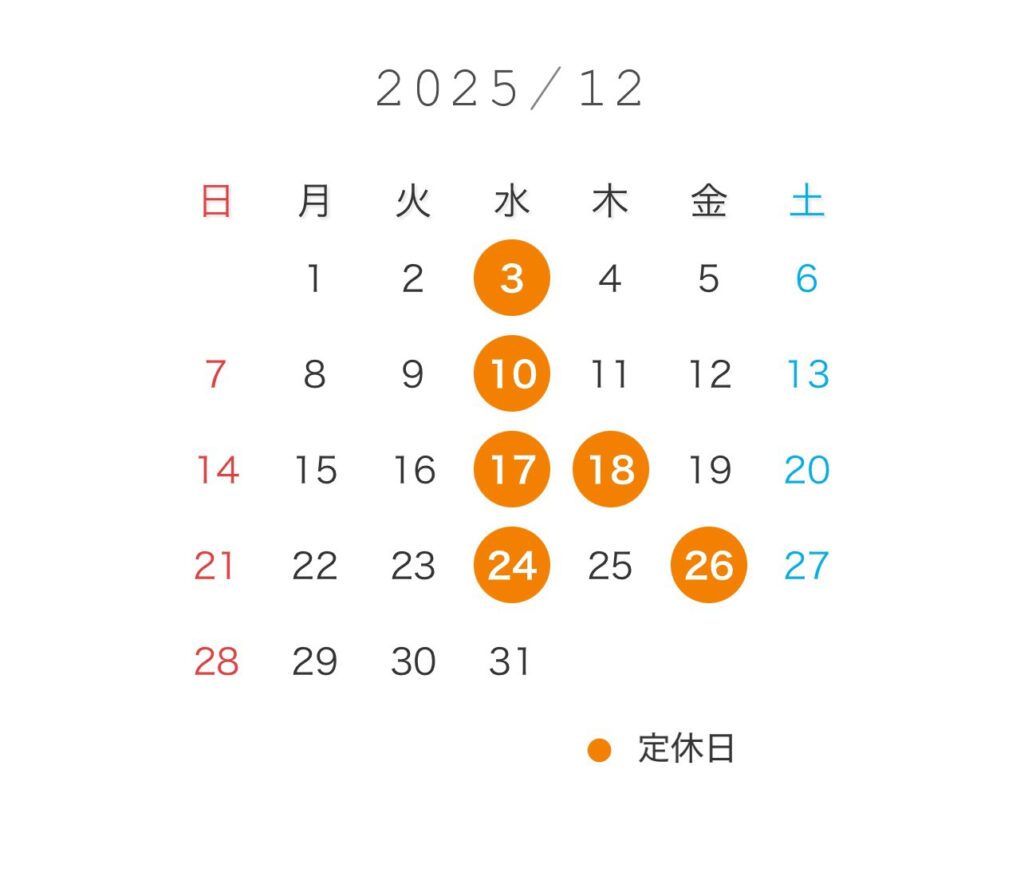 12月の定休日は、12月3,10,17,18,24,26日となっております。
