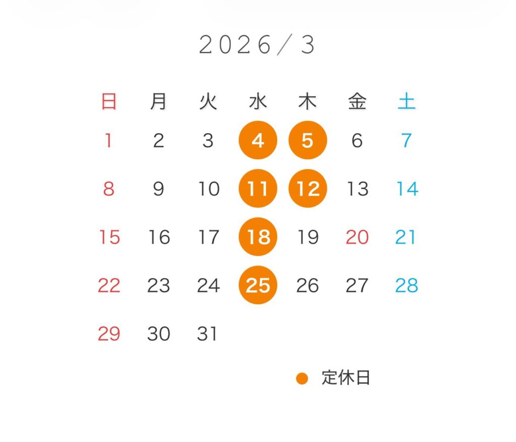 3月の定休日は、4,5,11,12,18,25日となっております。