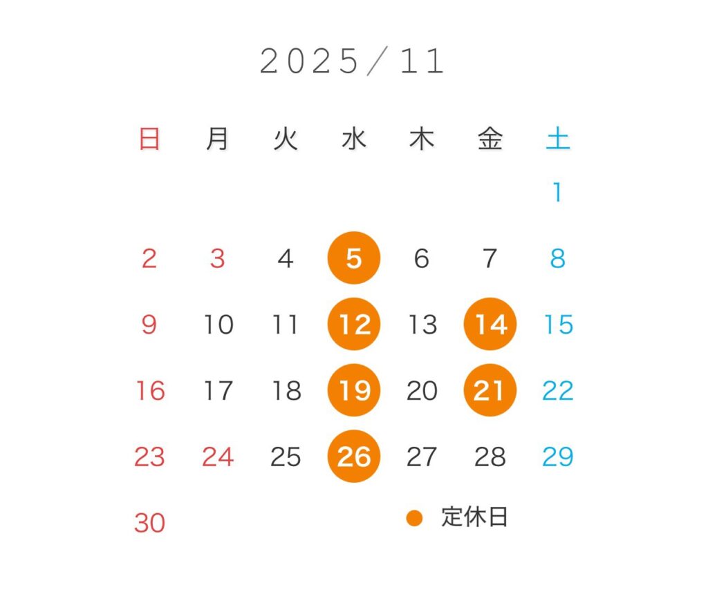 11月の定休日は、5,12,14,19,21,26日となっております。